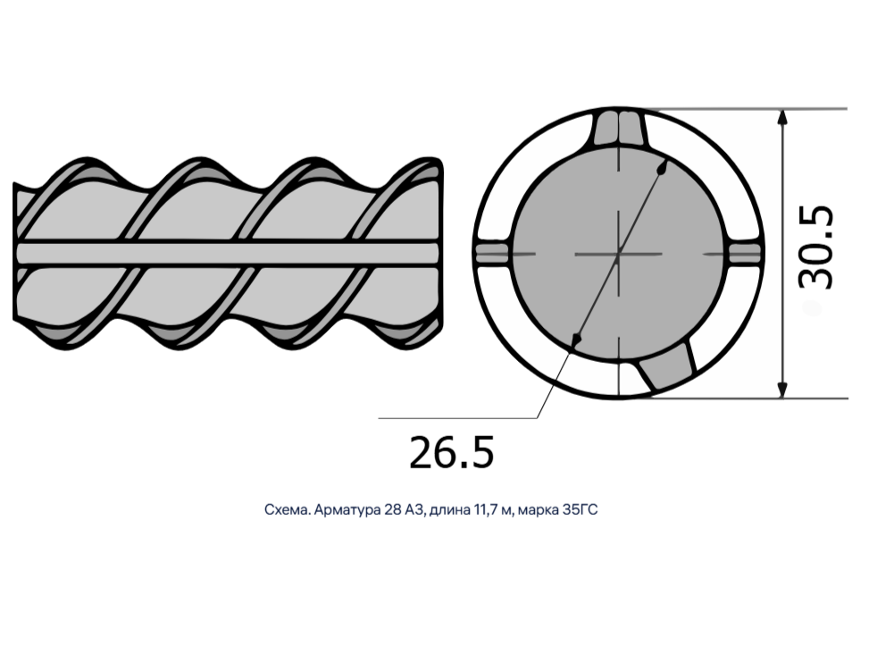 Арматура диаметром 28 мм класса А3 марки 35ГС длиной 11,7 м используется для армирования бетонных конструкций.