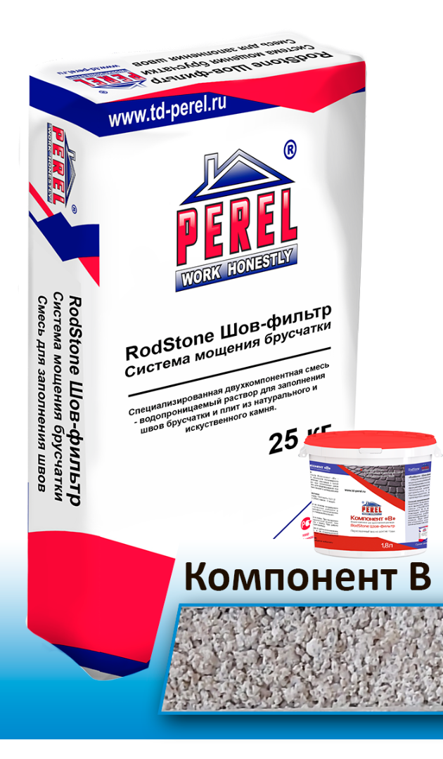 «RodStone – Шов фильтр» - специализированный двухкомпонентный водопроницаемый раствор на основе полимерцементного вяжущего вещества и фракционированных кварцевых песков для заполнения швов брусчатки и плит из натурального и искусственного камня. Рекомендуется для лёгких и средних транспортных нагрузок.