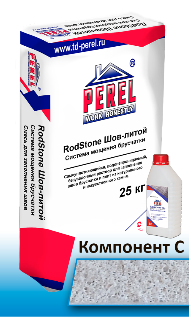 «RodStone» – Шов литой» - специализированный двухкомпонентный самоуплотняющийся, водонепроницаемый, безусадочный раствор на основе портландцемента, кварцевых песков и комплекса полимерных добавок для заполнения швов брусчатки и плит из натурального и искусственного камня. Подходит для любых транспортных нагрузок.