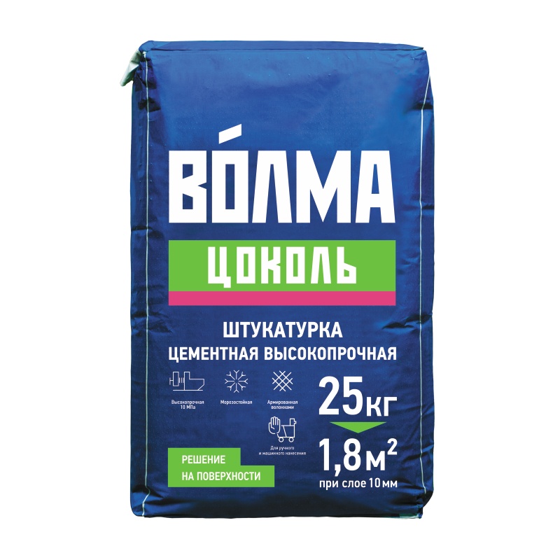 ВОЛМА-Цоколь - сухая цементная выравнивающая штукатурная смесь на основе портландцемента, минеральных наполнителей с полимерными и модифицирующими добавками, трещиностойкая, высокопрочная, армированная волокнами.